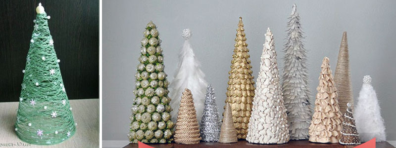 Esta es una variante de árbol muy fácil de hacer que se puede utilizar hilo, o cualquier material. Para realizarlo hay que dibujar un molde redondo en una cartulina que va a servir como base del arbolito. Una vez que tenemos el circulo marcamos el centro y desde allí dibujamos una línea recta hacia el borde exterior y la cortamos para armar el cono. Lo pincelamos completo con vaselina para que no se pegue y sea facil sacarlo. Sumergimos el hilo en agua y pegamento tipo cola escolar, y lo vamos enrollando alrededor del cono comenzando por el extremo superior. Dejamos secar por algunas horas y retira con mucho cuidado despegando el hilo del molde y listo. Podemos rociarle un poco de purpurina antes que seque o pegarle algunas decoraciones, también se puede hacer, en lugar de hilo, con otro material y dejarle la cartulina como base.