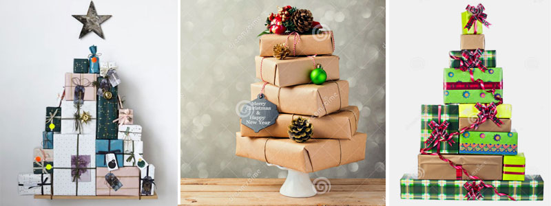 Es una manera original de armar el arbol con los regalos / presentes que vas a entregar esta navidad. Solamente tienes que apilar los paquetitos formando el árbol en algun rincon y pega una estrella en la punta.